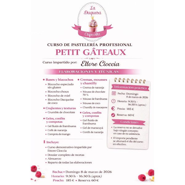 Descripción del curso:Curso demostrativo de pastelería moderna, centrado en la elaboración de Petit Gâteaux profesionales.
